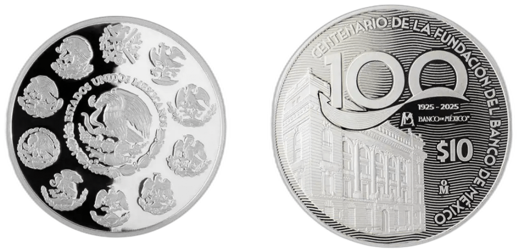 - Reverso: muestra el edificio principal del Banco de México, acompañado del logotipo con la leyenda: “100. 1925-2025. BANCO DE MÉXICO”. Además, en el borde se lee “CENTENARIO DE LA FUNDACIÓN DEL BANCO DE MÉXICO”, junto a la denominación $10 y la ceca M° de la Casa de Moneda.